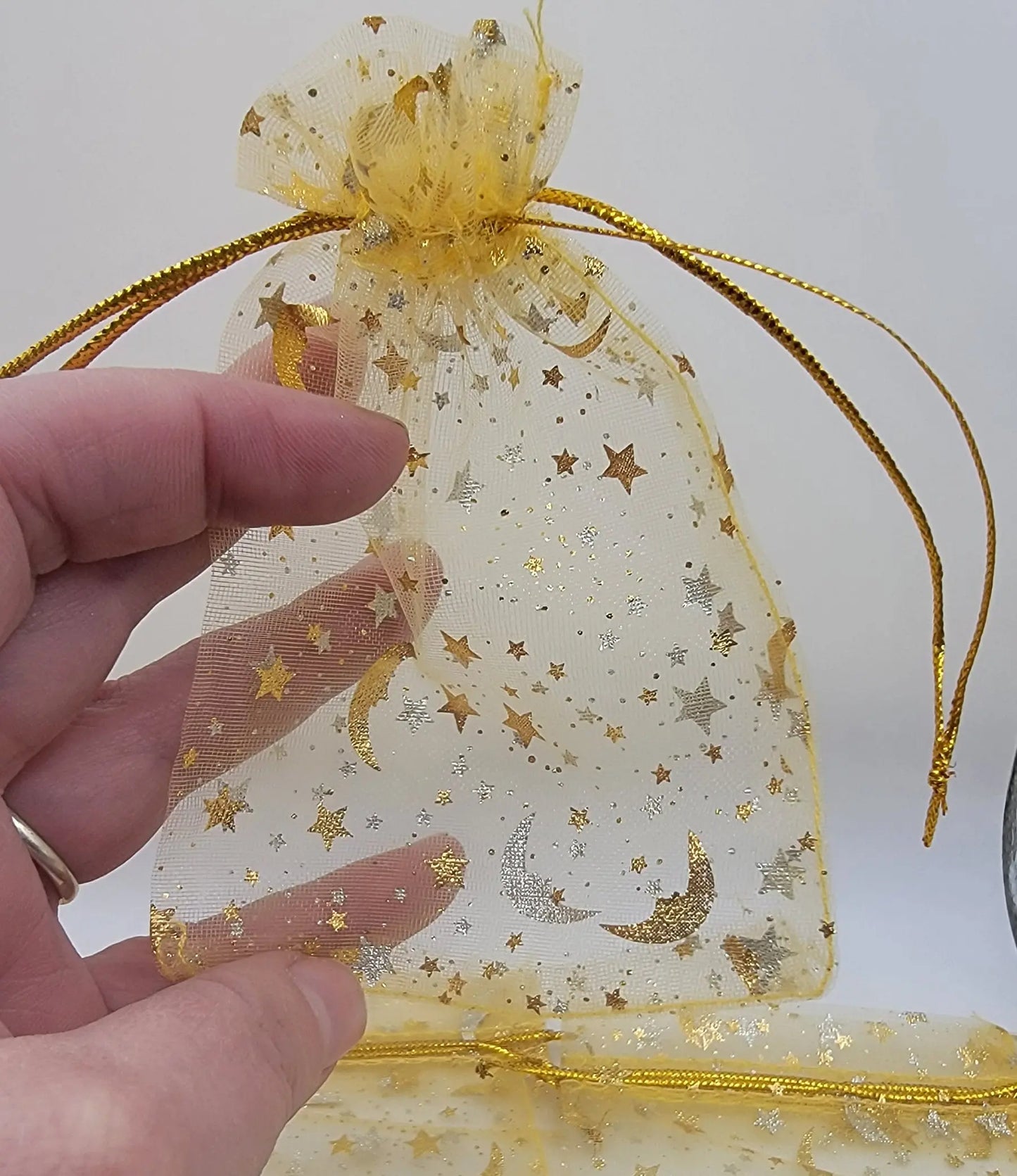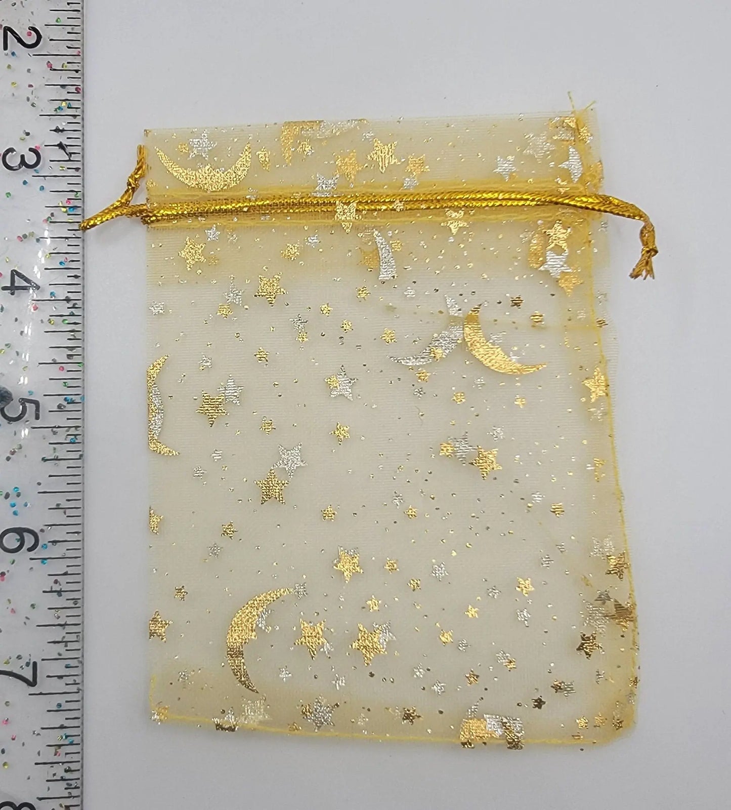Golden Moon & Stars Organza Drawstring Bag BAG-0044 (Approx. 4”x 4 1/2”) Excellent for storing crystals or using in crystal grid. You will receive one bag similar to that pictured in this listing. Great gift for yourself and others. See more at stonepathtrading.com