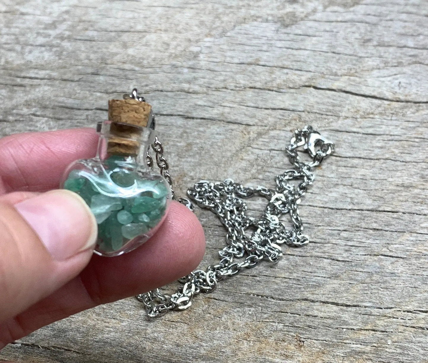 Green Aventurine Necklace in Corked Bottle, 24" Chain 1171 Believed to be a gentle stone that brings calm, balance and tranquility, and to be a good overall healer. And to bring an increase in prosperity, love and success. See more at stonepathtrading.com
