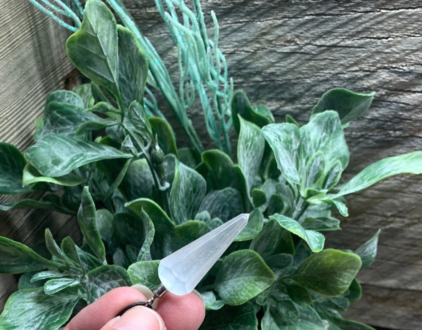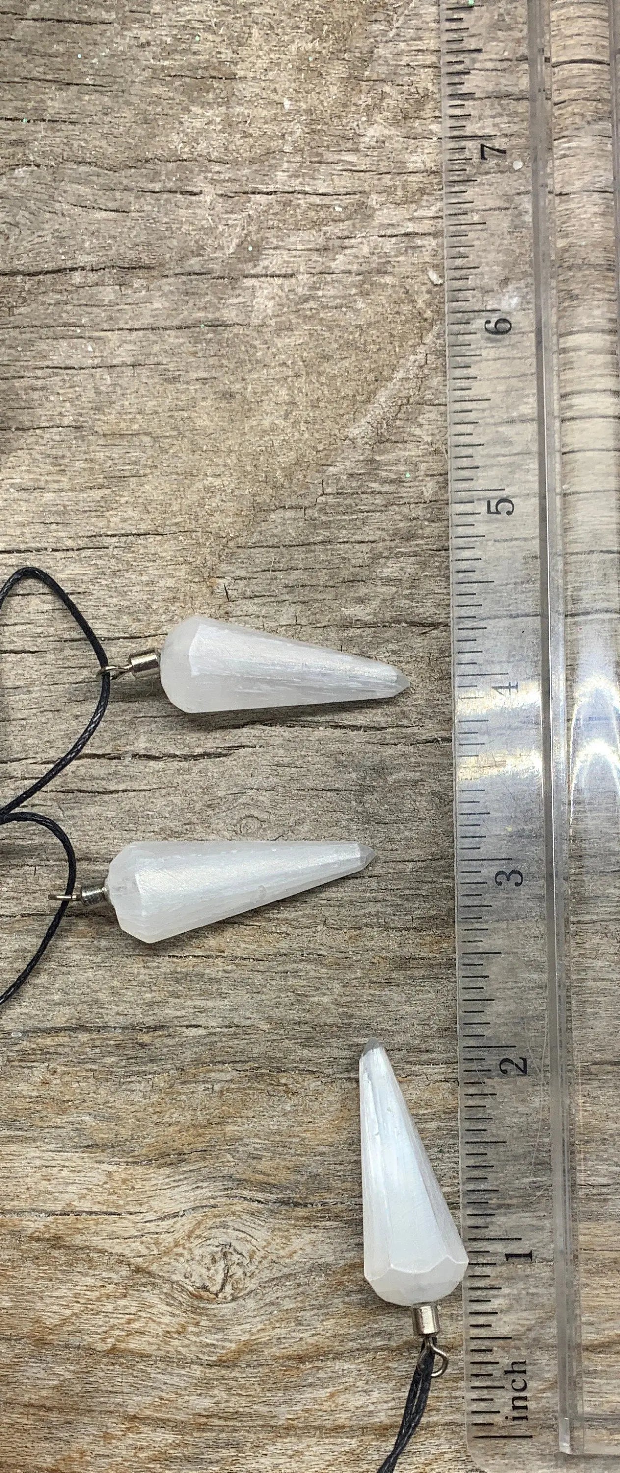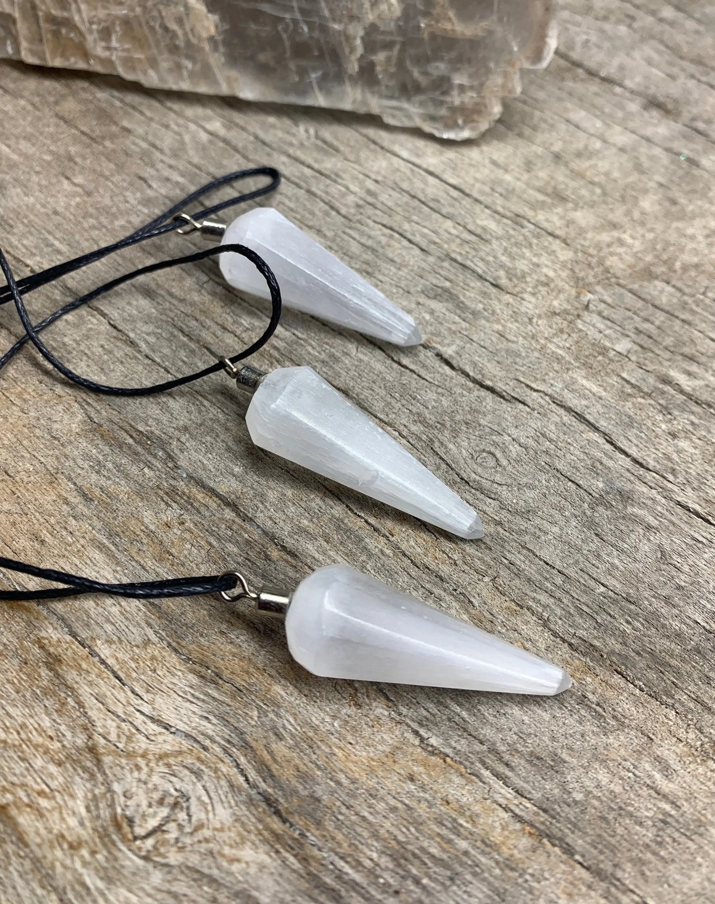 Selenite Pendulum Pendant Necklace 0929 Selenite is a calming Stone that instills deep peace. Excellent for meditation and Spiritual work. See more at stonepathtrading.com